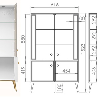• Vorderseite und Oberseite glänzende MDF-Platte (Kleiderschrank 01 und Vitrine 02 oben matt)