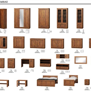 An den Fronten eine Latte aus MDF. Die Kantenenden enden enden mit einem langlebigeren und widerstandsfähigeren PVC-Furnier. Das System besteht unter anderem aus geräumigen Schränken, praktischen Kommoden und klassischen Vitrinen. Tadeusz Möbel in zwei Farben erhältlich: Lefkas Eiche und hundertjährige Eiche.