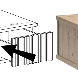 Interessantes Design, einzigartige Konstruktion mit der Verwendung einer Leiste als Griff, die für das ergonomische Öffnen von Schränken entsprechend schräg geschnitten wurde. Die warme, natürliche Farbgebung der Elemente passt zu fast jeder Einrichtung. Die Möbel sind in der Farbe Artisan gehalten und mit einer matten schwarzen Tafel versehen. Helle Latten auf dunklem Grund passen zum modernen Stil der Einrichtung. Dank dieser Kollektion können wir einen spektakulären Effekt im Wohnzimmer erzielen, vor allem an der TV-Wand, wo wir das Wandpaneel mit dekorativen Lamellen verwenden können.Die Möbel können dank der soliden, 10 cm hohen Metallfüße hochgezogen werden, was es uns ermöglicht, das Haus sauber zu halten.