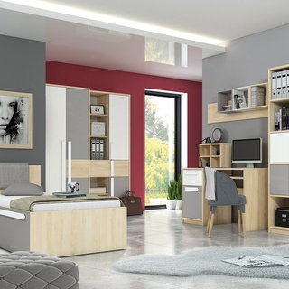 Das moderne Möbelsystem Drop wurde nach den neuesten Trends entwickelt. Die Wahl der Farben des Körpers von Fronten und Einsätzen passt sowohl zum Raum des Jungen als auch zum Mädchen.